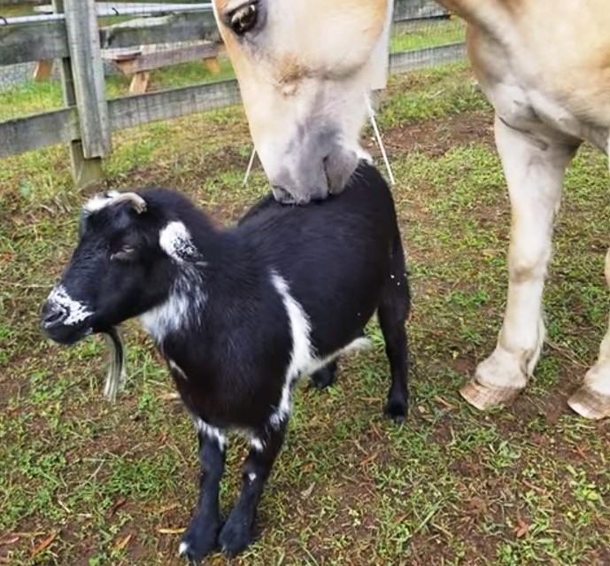 En sus primeros pasos de socialización con otros animales, Cupcake se inclinó a lamer a Spiffy, una cabra que ha disfrutado mucho de la compañía de este caballo.