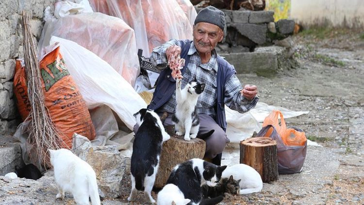Su nombre es Ali Sayin, tiene 78 años, hace 21 años que se jubiló de la Dirección Nacional de Educación, desde ese entonces sale cada mañana de su casa y camina 1 kilómetro hasta el rio Çoruh para pescar el alimento de sus animales. En su casa tiene 20 gatos y atiende a 15 gatos callejeros. Además, compra algo de hígado y vísceras en la carnicería para completar el alimento.