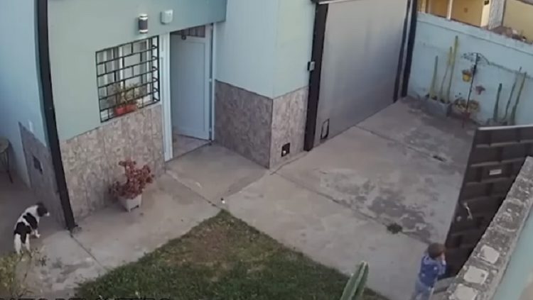 En las imágenes se puede ver cómo el infante sale directamente al patio delantero, donde se encontraban sus fieles amigos caninos.