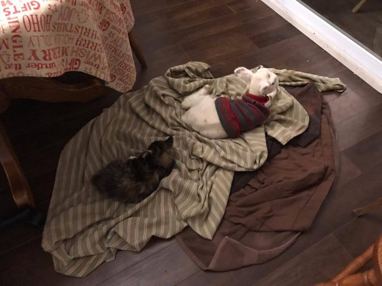 Pero no sólo los voluntarios humanos estaban atentos de Charlie; Dora, la gatita que había sido rescatada en noviembre, siempre estuvo allí también para Charlie.