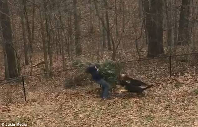 Cuando sus dos perros de raza pastor alemán lo vieron acercarse al patio, supieron que tenían que luchar por su adorado árbol. Ellos no permitirían que su parte favorita de la Navidad fuera desechada sin piedad, así que comenzaron a defenderlo. Mientras David intentaba caminar hasta la cerca, ellos se aferraban del otro extremo del árbol para frustrarle sus planes.