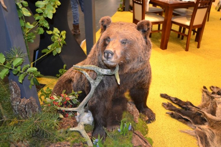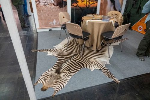 En la feria se vendieron sillas cubiertas con piel de cebra, cojines de piel de zorro, guepardos rellenos, cabezas de oso y trampas crueles diseñadas para atrapar animales desprevenidos.