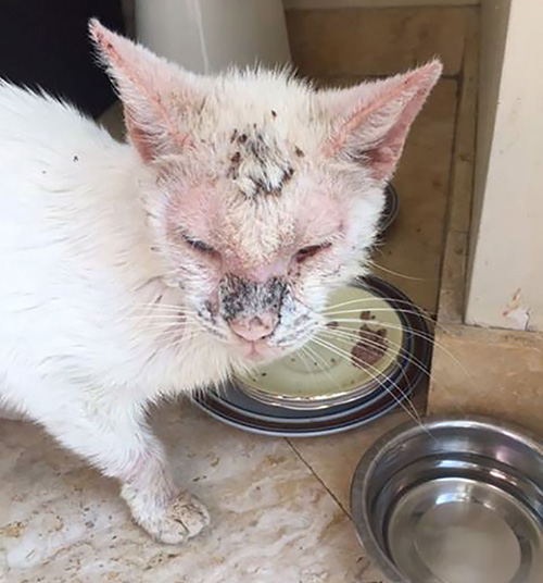 Esta ceguera le hacía imposible moverse y alimentarse, lo que provocó que sufriera desnutrición; para un gato en este estado, la vida ya no tenía sentido, y si no era ayudado pronto iba a fallecer.