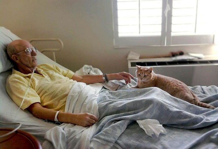 Tom al darse cuenta que el veterano del ejército estaba muriendo saltó sobre la cama, enseguida apoyó su patita sobre la mano extendida de este hombre, “fue un hermoso paso” dijo Elizabeth Gehlert. «Y ese gato es el que lo hizo posible».