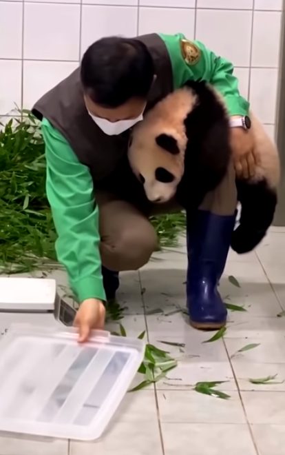 El simpático plantígrado de origen chino se ve muy necesitado de protección y cariño, en el momento cuando el empleado del zoológico le hace un pesaje de rutina. Al acercarse, el animal se aferra con firmeza a una de las piernas del hombre, sin querer separarse de él, rogándole que no lo deje y que se quede a su lado.