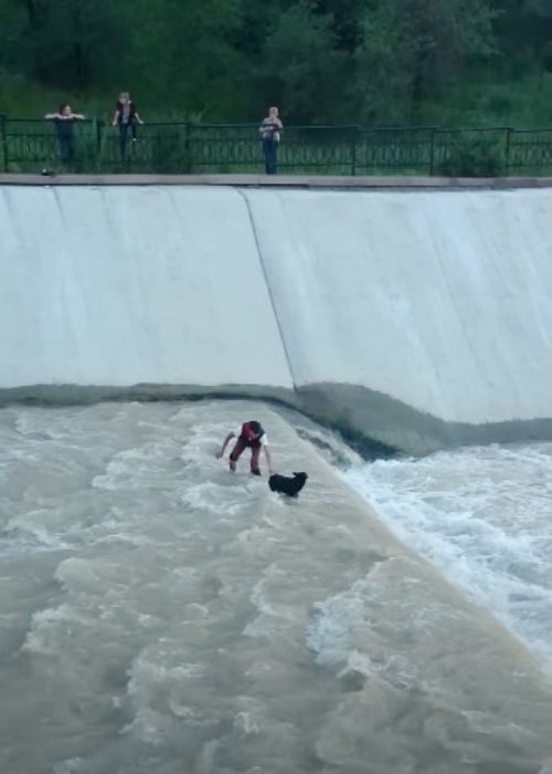 Realizaron varios intentos y finalmente lo lograron. El chico utilizó una de sus manos para tomar la de uno de sus amigos y con la otra empujaba al perrito para asegurarse de que no se quedase atrás. Marjana Khadreeva era una mujer que estaba pasando por el otro lado del canal.