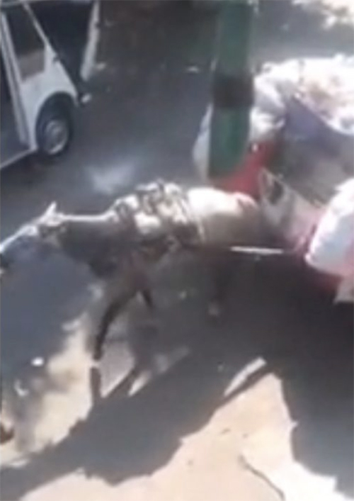 Las fuerzas del animal no le permitían avanzar por la exagerada carga, pero el testarudo e inconsciente dueño lo obligaba a fuerza de gritos y empujones. Una transeúnte que pasaba se molestó al ver el trato al que se estaba cometiendo al animal, y amenazó al hombre con denunciarlo.