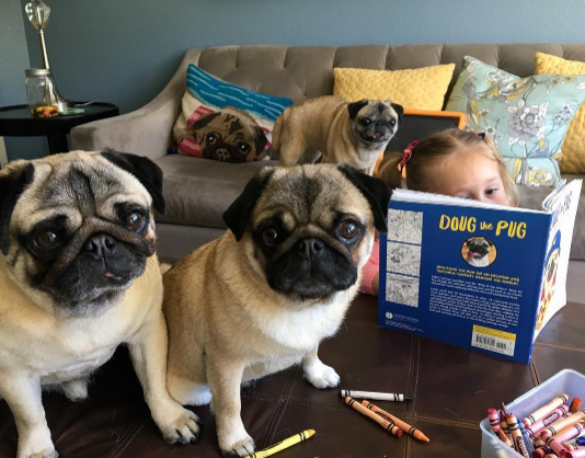 Kennedy Green es una hermosa niña que no se cansa nunca de sus pugs. Ella vive en San Francisco y tiene apenas dos años. Estos tres perritos se llaman Barnum, Bailey y Tahlulabelle, los tres han sido inseparables desde el primer día. ¡Son mejores amigos! Cuando se ponen a jugar, ella siente que es uno de ellos, también toman la siesta juntos y los perros están incluidos en casi todas sus actividades diarias.