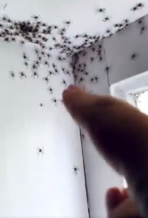 Esa simple imagen ya resultaba bastante sorprendente, pero la niña le dijo que debía darle un vistazo a la otra esquina. Resulta que había un montón muchísimo más grande de arañas a pocos centímetros de allí. Contarlas era prácticamente imposible. La nerviosa madre no pudo hacer más que sacar su teléfono y enviarlo a sus amigos en búsqueda de consejo.