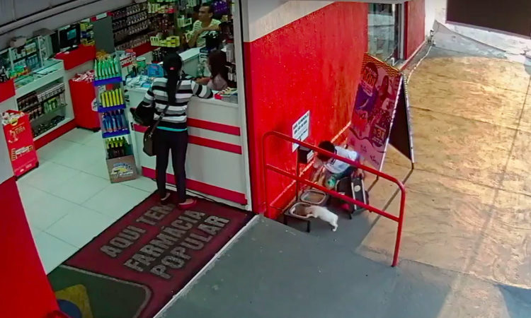 In Caldas Novas, Brazil, a child found an abandoned puppy as he leaves school and tries to help by putting the dog in his bag, so he can leave it at the door of the pharmacy, where someone can help.Note that in front of the store there is a stand with water and food.