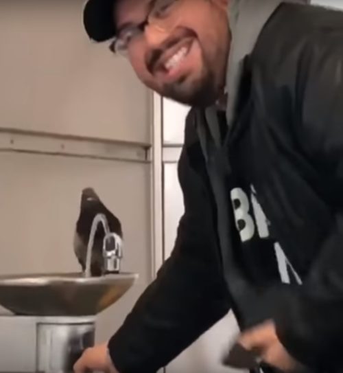 Él se acercó con el fin de ayudarla, presionó cautelosamente el botón de la fuente para que el ave pudiera beber y calmar su sed.