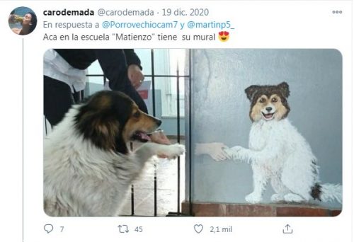 Una mujer publicó el mural de un perrito que fue adoptado en otra escuela.