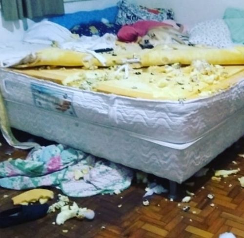 Patricia Barros, de 48 años, Gerente Comercial de Bauru, grabó la escena protagonizada por su querido perro llamado Chico (diminutivo de Francisco en Brasil), que la recibió acostado en la comodidad de la cama que acaba de destruir, con la panza al aire y batiendo la cola, esperando el afecto de su dueña como si no fuera el causante de todo el caos.