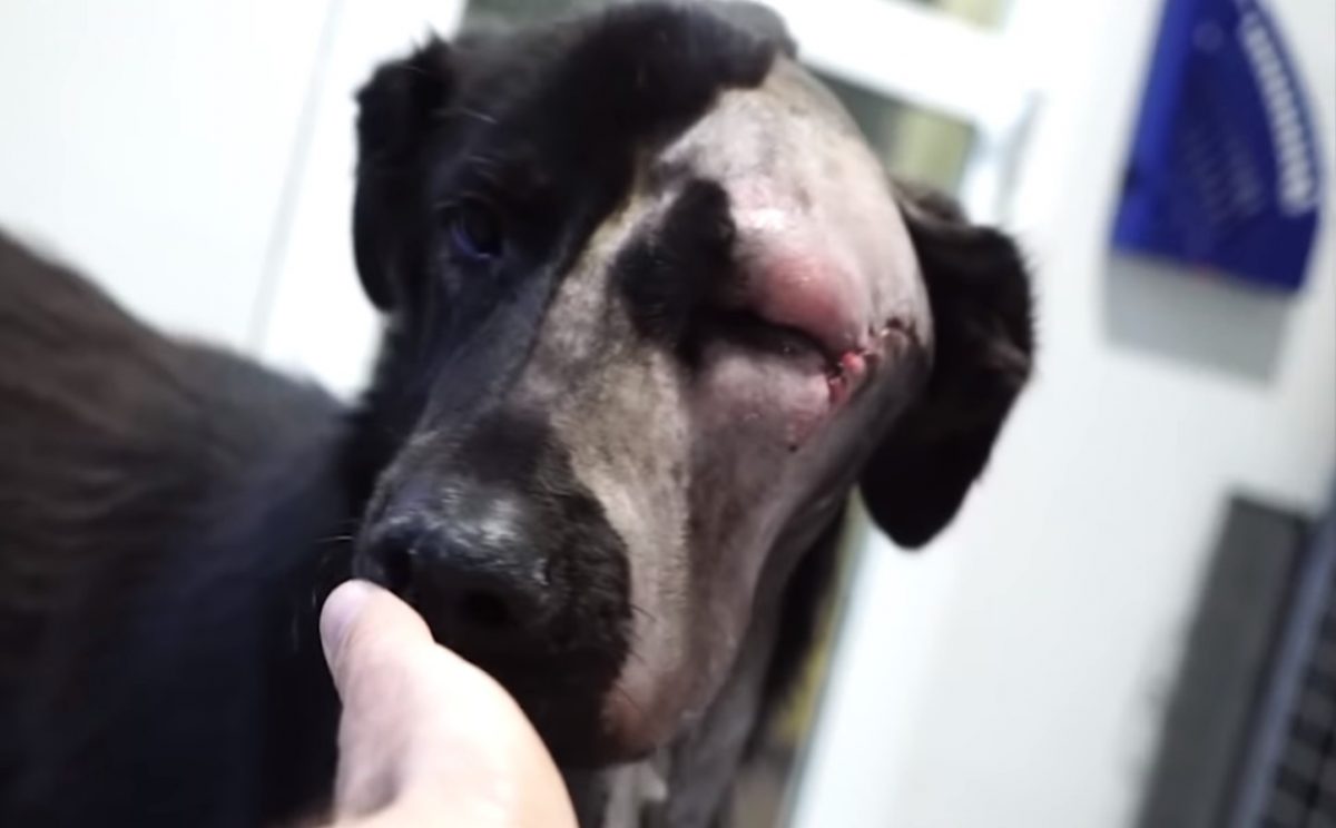La perrita fue encontrada sola en un campo, estaba muy demacrada con graves signos de desnutrición, sufrió un fuerte golpe en la cabeza que causó que el lado derecho de su mandíbula se desprendiera.
