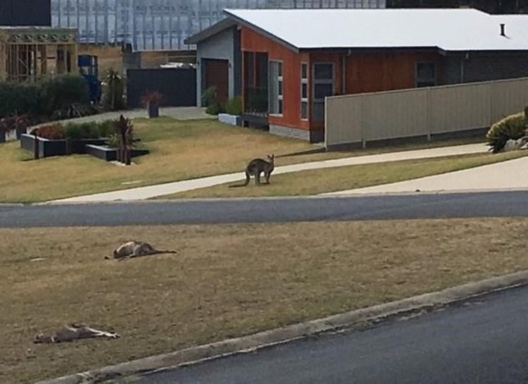 La policía sospecha que todo sucedió la noche del sábado entre las 10:30 y 11:30. En el asfalto y parte del césped se puede ver la marca que han dejado las llantas de un vehículo; de modo que conducía a una velocidad tan alta que los pobres canguros no tuvieron tiempo de salvar su vida.