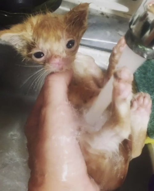 También, Smush tuvo que someterse a múltiples baños para ayudarla a acabar con la tiña y la pequeña felina no se quejó en ningún momento, era toda una valiente.