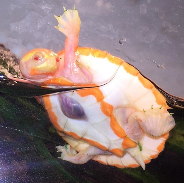 Una adorable tortuga albina rosada nacida con su corazón expuesto latiendo fuera de su cuerpo ha desafiado todas las probabilidades y parece estar prosperando a pesar de las increíbles adversidades que ha tenido que atracesar.