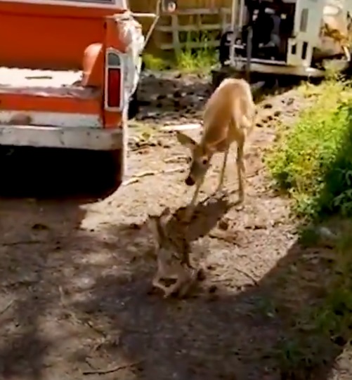 La madre cierva escuchó sus gritos desde la distancia, y rápidamente se acercó en busca de su pequeño perdido.