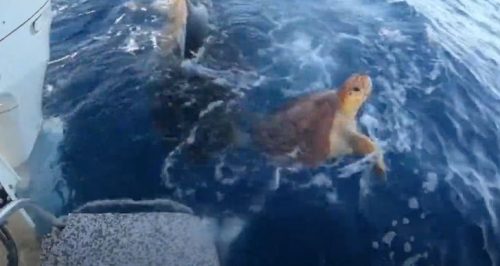 En ese momento, los jóvenes pescadores se acercan a la tortuga y la sacan del mar para dejarla dentro del barco.