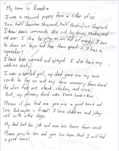 Al leer el mensaje escrito, se enteró de que el padre humano de Roadie había perdido su empleo a consecuencia de la situación pandémica mundial y se había visto en la necesidad de dejar ir a su querida mascota.