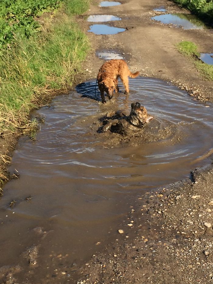 Cuando Jewell vio la enorme piscina que había dejado la lluvia, no lo podía creer, inmediatamente comenzó a correr y correr, simplemente no podía parar de hacerlo, estaba tan emocionado y feliz que solo daba vueltas. Su familia lo observaba y entre carcajadas lo animaban a seguir disfrutando de su juego, incluso los niños disfrutaban más de ver lo feliz que estaba su mascota que jugar ellos mismos con el lodo.